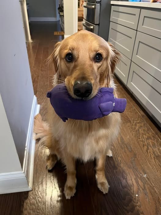 There is something unmistakably powerful about the way a dog looks at you when they’re holding a toy. In this moment, standing patiently on the kitchen floor, eyes wide and hopeful, this golden soul isn’t just carrying a purple plush—he’s carrying an invitation. An invitation to play, to connect, to pause whatever you’re doing and enter his world, even if only for a minute.